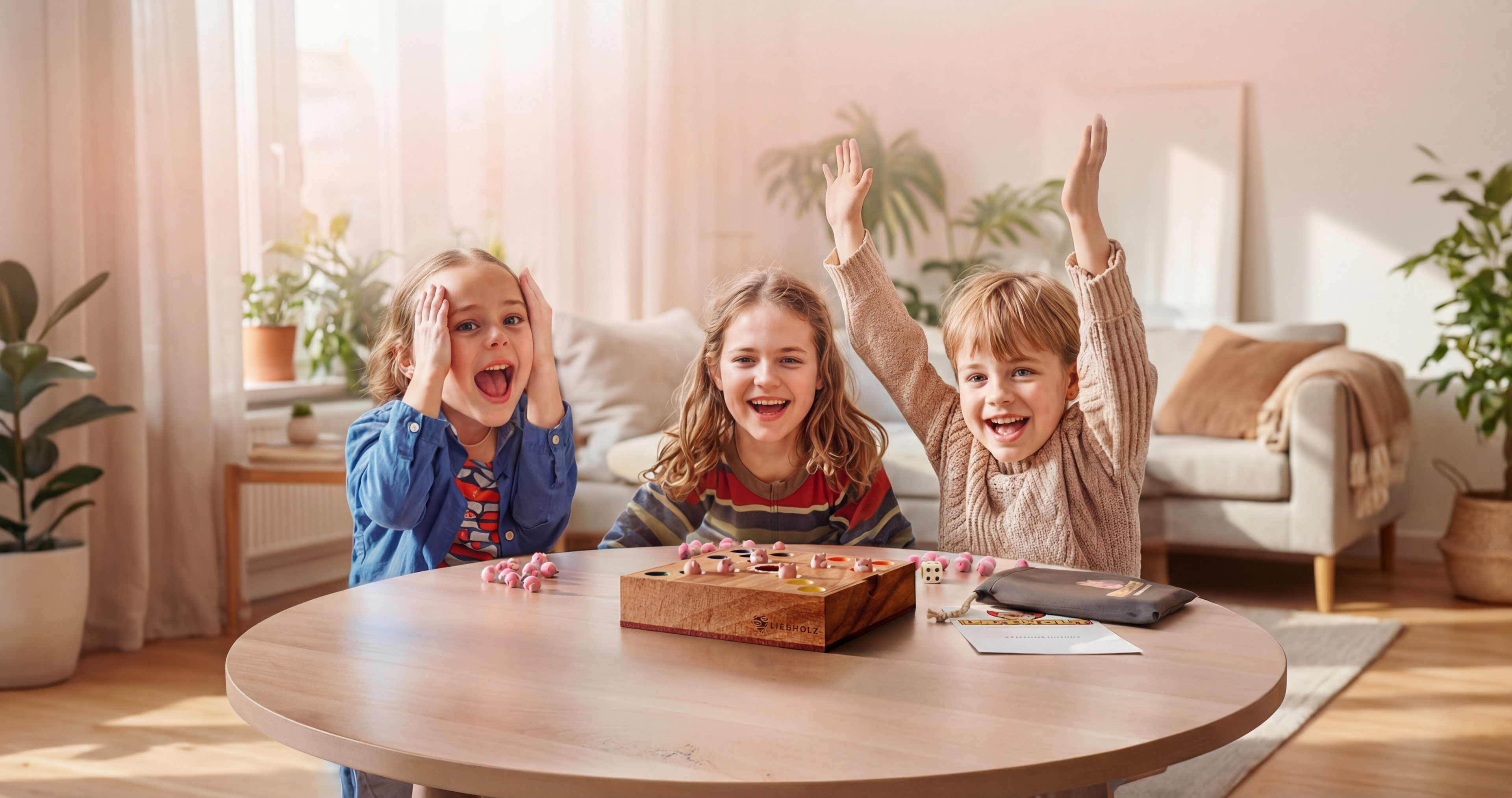 Gemeinsam statt scrollen: Unsere 10 Holzspiele bringen Ruhe, Spannung und Nähe an den Tisch. Von Ferkelfieber bis Kalaha – familienbrettspiele als spiele ohne bildschirm, die Kindern wie Erwachsenen sofort Spaß...